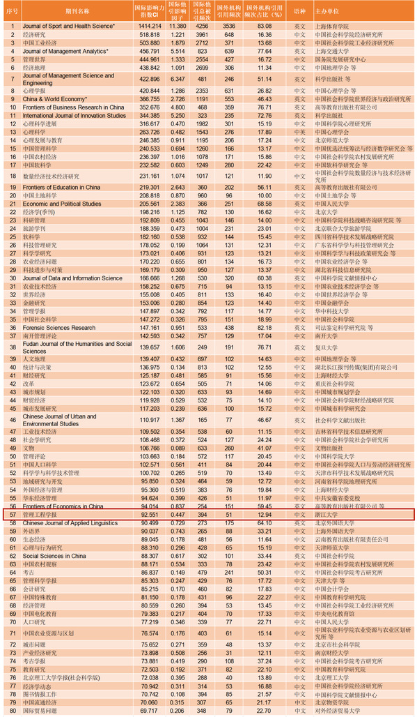 以Journal of Sport and Health Science、《经济研究》《中国工业经济》等为代表的80种人文社科类学术期刊入选“中国最具国际影响力学术期刊(人文社会科学)”。
