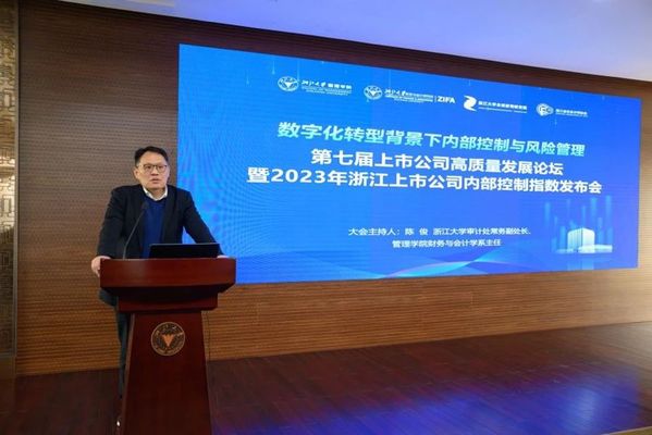 会上,来自相关政府机构、监管部门、协会、高校、上市公司、中介机构等单位的专家学者及业界精英围绕“数字化转型背景下内部控制与风险管理”,共探浙江上市公司内部控制建设的现状以及面临的机遇与挑战。本次大会由浙江大学审计处常务副处长、管理学院财务与会计学系主任陈俊教授主持。他表示,党的二十大报告指出,高质量发展是全面建设社会主义现代化国家的首要任务。如今我国经济正由高速增长转向高质量发展阶段,上市公司作为企业的领头羊、生力军,扮演着非常重要的角色。当前国际贸易局势错综复杂,对企业的可持续发展产生了非常重要影响,因内部控制失败爆出的黑天鹅事件频发。在此背景下,“第七届上市公司高质量发展论坛暨2023年浙江上市公司内部控制指数发布会”隆重召开,共同深入探讨企业内部控制与管理的问题与实践。