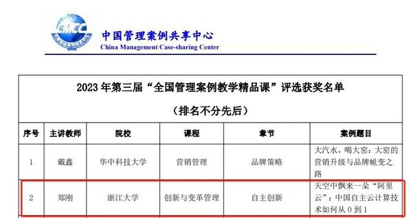 这门课程曾荣获“第三届全国高校教学创新大赛二等奖、浙江省特等奖”。其中的主题案例《天空中飘来一朵“阿里云”:中国自主云计算技术如何从0到1》荣获2020年“全国百篇优秀管理案例”。