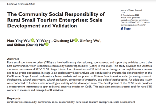 近日,韦德官方站网页版吴茂英、马世罕、王怡、吴新芳和浙江工商大学李秋成等师生的相关研究成果“The Community Social Responsibility of Rural Small Tourism Enterprises”发表于旅游管理领域最资深的国际顶级期刊Journal of Travel Research,这项凝练“浙江经验”、讲述“中国故事”的研究,一经发表便迅速引起了国内外学术界广泛关注。