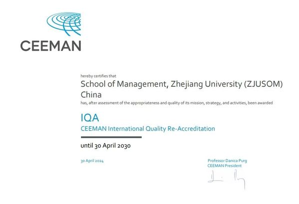 浙大管学院成为中国首家获得CEEMAN IQA认证的商学院。
