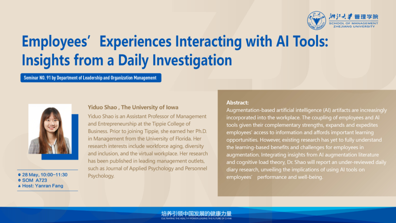 Augmentation-based artificial intelligence (AI) artifacts are increasingly incorporated into the workplace. The coupling of employees and Al tools given their complementary strengths, expands and expedites employees' access to information and affords important learning opportunities. However, existing research has yet to fully understand the learning-based benefits and challenges for employees in augmentation. Integrating insights from AI augmentation literature and cognitive load theory, Dr. Shao will report an under-reviewed daily diary research, unveiling the implications of using AI tools on employees’ performance and well-being.