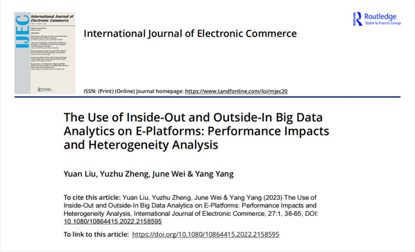 此前,韦德官方站网页版教授刘渊、博士生郑雨竹及团队发表一篇论文《在电子平台上使用由内向外和由外向内的大数据分析:性能影响和异质性分析》,阐释了企业使用大数据分析创造商业价值的微观过程,打开了大数据分析使用和企业绩效提升之间的“黑匣子”。
