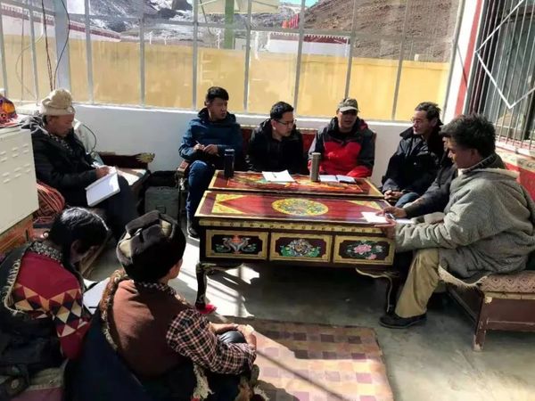 首届西藏班毕业生拉巴多吉(右4)与当地村民交流