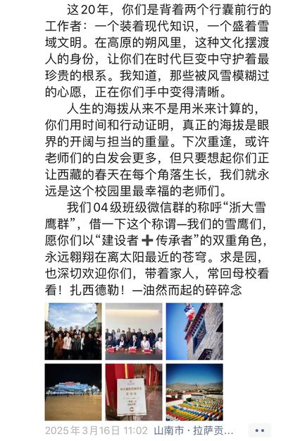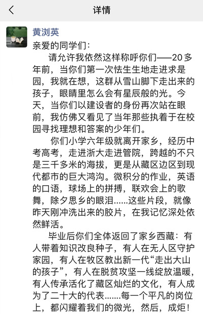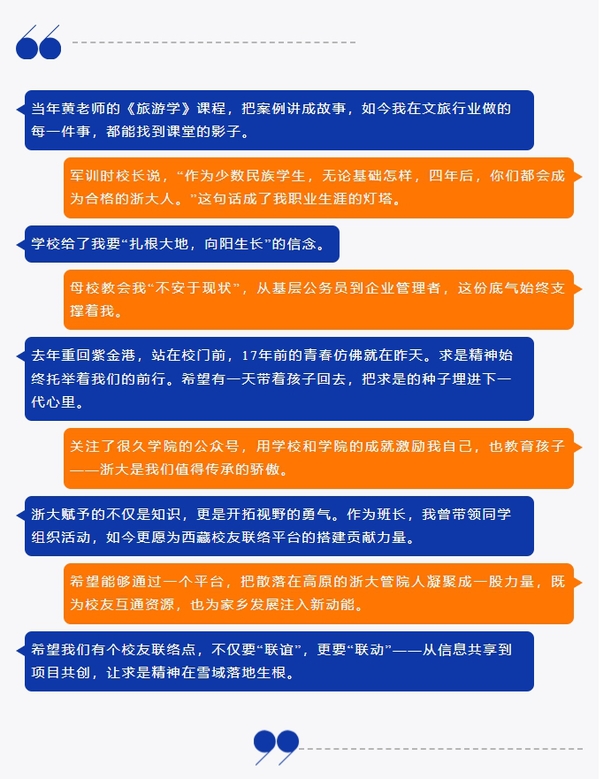 前段时间,首届旅游管理本科内地西藏班班主任、浙大管院旅游与酒店管理学系副教授黄浏英,关注到西藏班的班级群格外活跃,不少校友在群里表达对管院老师和同学的牵挂,期望母校能在西藏开设校友联络点,便于大家常常相聚交流,重温在管院的求学岁月与师生情。