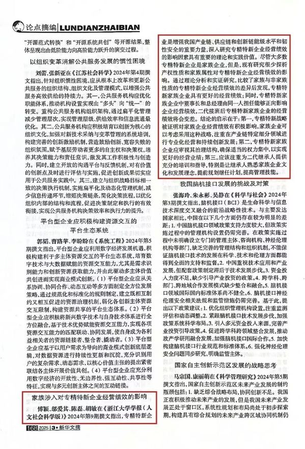 近日,《新华文摘》第807期对邬爱其团队的研究成果——《促进还是抑制:家族涉入对专精特新企业经营绩效的影响》进行了核心论点摘编刊载。
