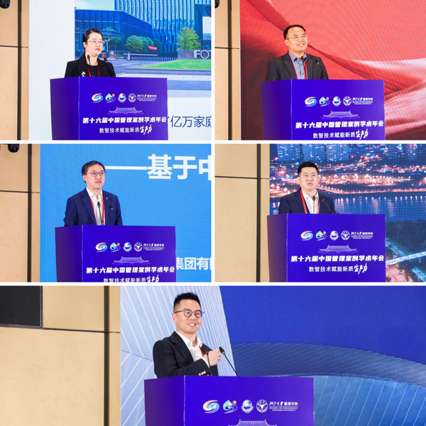 随后,方太集团副总裁特别助理赵芳瀷、杭州万事利丝绸文化股份有限公司副总经理滕俊楷、金蝶国际软件集团有限公司金蝶中国管理模式研究院院长曾昊、中航金城无人系统有限公司技术总监朱石晶、中数求索信息系统(上海)股份有限公司总经理吕宝分别分享了各企业的数智转型经验。他们在数智时代背景下深入剖析了企业管理领域的创新实践与现实挑战,不仅为案例研究者带来了源于企业一线的实际问题,也为案例研究进程中的产教融合、产研融合提供了全新的探索方向。