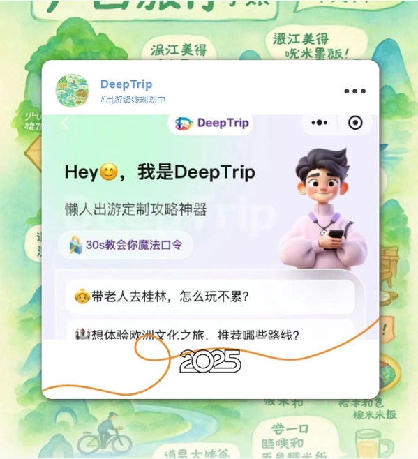 “DeepTrip”是什么?此前,同程宣布其自主研发的旅游专属大模型程心AI”正式完成与DeepSeek的技术融合,推出“AI+ 实时预订服务。在对话框里输入问题后,DeepTrip就可以开始进行深度分析,完成确认出行时间、分析旅行偏好、确认查询区域、规划景点组合、补充服务需求、核对信息准确性等在内的一系列方案生成过程,不仅能生成“AI手绘图,还会直接跳出从出发地到目的地的车票弹窗,供用户一键购买。