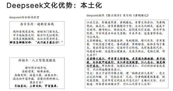 而当用户让DeepSeek仿照千古第一骈文《滕王阁序》写《黄鹤楼记》时,其中庚子抗疫,白衣执甲逆流行一段,将历史与现实结合,体现出AI创作的主动性和对时代变化的敏锐捕捉能力。可见,DeepSeek对于中国古代哲学、文学、美学的认知远远超过了其他模型,这种本土化优势不仅能够助力文旅内容的创新表达,更成为国际竞争中的差异化壁垒。