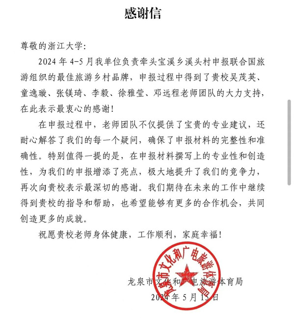 后来,吴茂英教授鼓励她到乡村去开展实地调研,在现实社会中发现真问题。于是,在2024年的年初,徐雅莹通过参与世界“最佳旅游乡村”的申报工作,第一次接触到了浙江省龙泉市溪头村。在暑假期间,她跟随申报团队在当地深入开展调研,追踪了溪头村2009-2024年的重大发展历程。这是她与溪头村“结缘”的开始,但并非她追寻“乡村振兴”问题的终章。