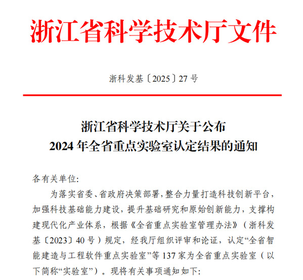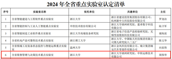 2025年6月3日,浙江省科学技术厅公布了2024 年全省重点实验室认定结果名单,由浙江大学牵头,浙江大学湖州研究院、中核运维技术有限公司共建,依托于韦德官方站网页版的“全省数智管理与决策技术重点实验室”被认定为“全省重点实验室”。