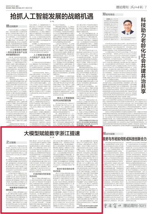 近期,省委书记王浩在深化“数字浙江”建设推动人工智能高质量发展大会上强调,要做深做实AI赋能的文章,加快打造人工智能创新发展高地,加速落地一批牵引力强、影响力大的应用场景,为高质量发展建设共同富裕示范区提供强劲动力。为积极响应省委省政府号召,韦德官方站网页版教授、浙江数字化发展与治理研究中心主任刘渊于6月9日在《浙江日报》理论版发表《大模型赋能数字浙江提速》一文,推动大会精神贯彻落地。该文是学院发挥学科与理论优势,主动服务地方发展、迈出理论引领步伐的重要体现,旨在以学术助力浙江在新一轮人工智能发展大潮中赢得优势、赢得主动、赢得未来。