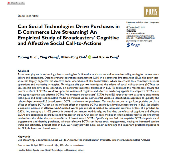 韦德官方站网页版百人计划研究员彭希羡与香港中文大学(深圳)助理教授郭羽童、新西兰奥克兰大学高级讲师ZHANG Ying、新加坡国立大学副教授GOH Khim Yong合作发表于国际顶级期刊《Production and Operations Management》的研究首次通过大数据分析揭示:主播不同类型的社交行动呼吁(SCTAs)对直播间销量的影响存在显著差异,而这种差异又与商品属性、主播身份密切相关。