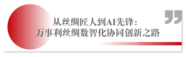 万事利与微软小冰、无界AI 等技术企业合作,推动 AI 在设计、生产、营销等环节的深度应用,建成全球首个丝绸花型大模型和高度柔性的智能制造体系;同时在政府、行业组织的支持下进行技术研发和推广,并联动西泠印社、宋韵文化等 IP 资源以及结合用户持续反馈,共同推进产品创意与市场共建。这一系列举措有效解决了丝绸行业“库存积压”与“印染污染”两大痛点,重塑了产业链条和商业模式,走出一条数智赋能、生态协同的可持续发展之路。此外,万事利加速打造 AI 未来工厂、花型交互智能体,实现从企业级技术创新向行业级生态赋能转型,推动产业全链条智能化升级。